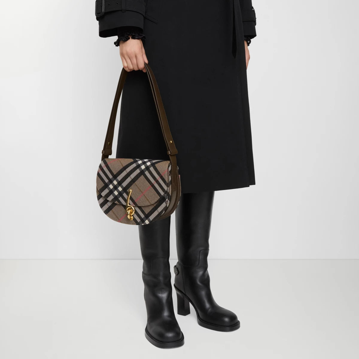 Inspiré par l'héritage équestre de Burberry, ce sac Bridle est confectionné selon une forme de selle en jacquard de coton mélangé à carreaux Burberry Check. Son fermoir "b" emblématique et ses détails en métal font référence aux rênes d'équitation. Conçu en Italie, ce modèle présente une doublure en cuir nappa et une sangle réglable pour le porter à l'épaule. Cette création a été révélée lors du défilé Burberry Hiver 2025.