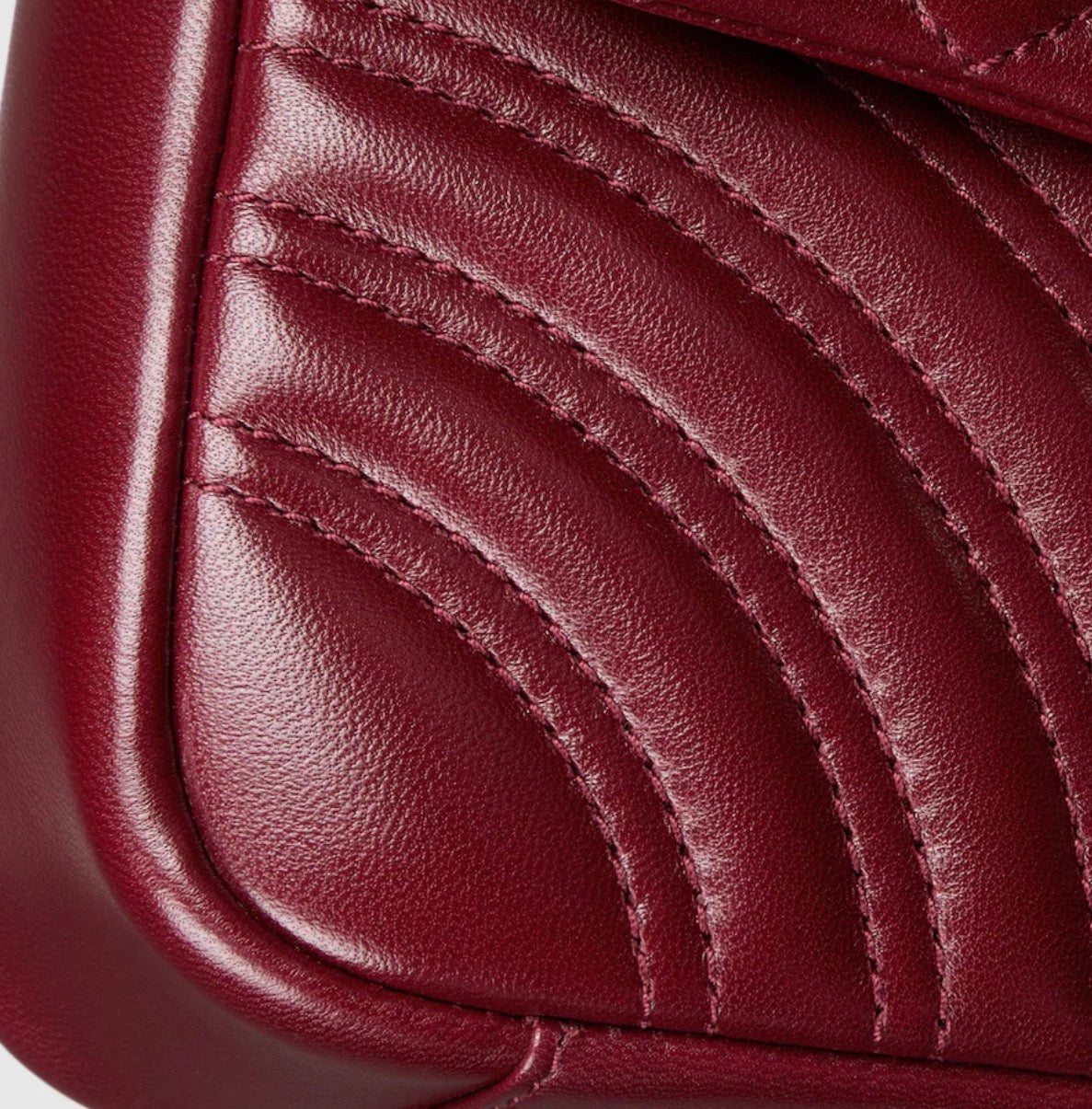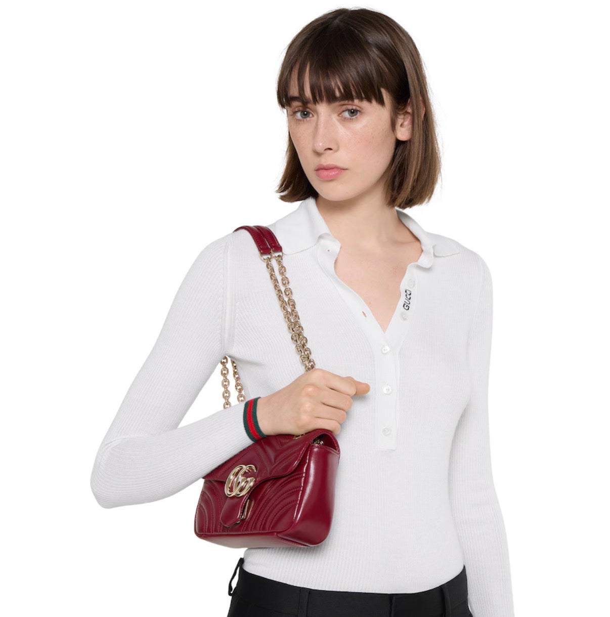La collection GG Marmont emblématique de la Maison se caractérise par le détail Double G, une bandoulière chaîne à facettes et une construction en cuir exceptionnellement souple.